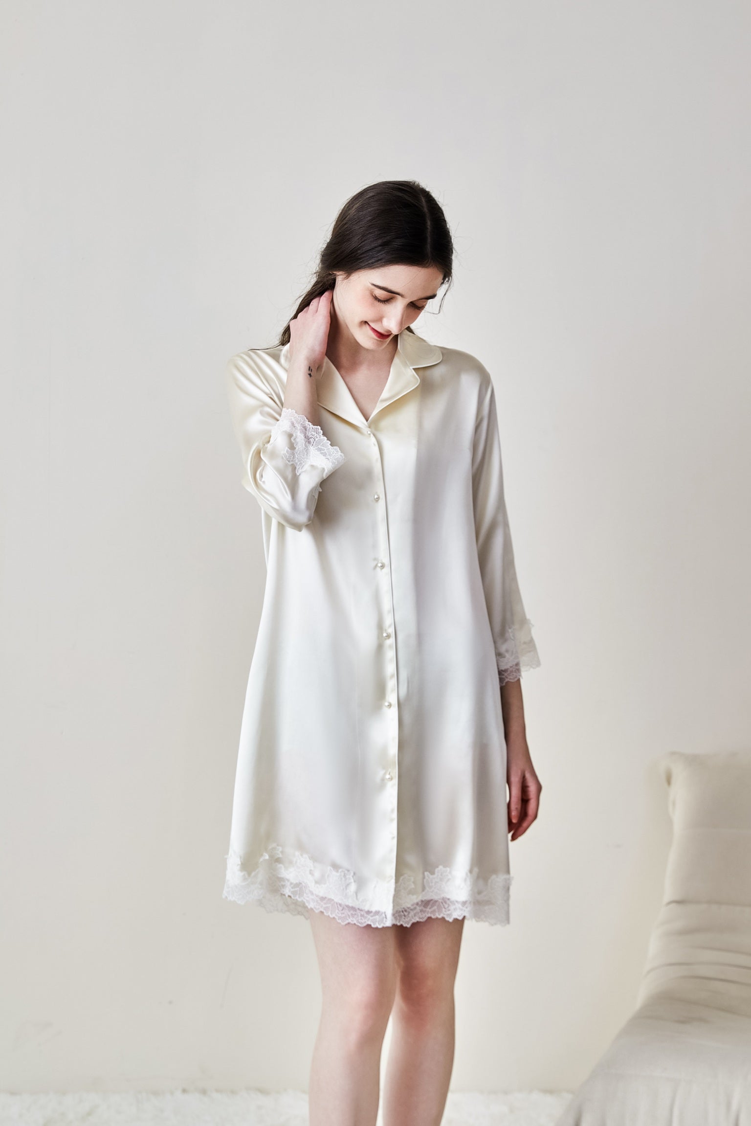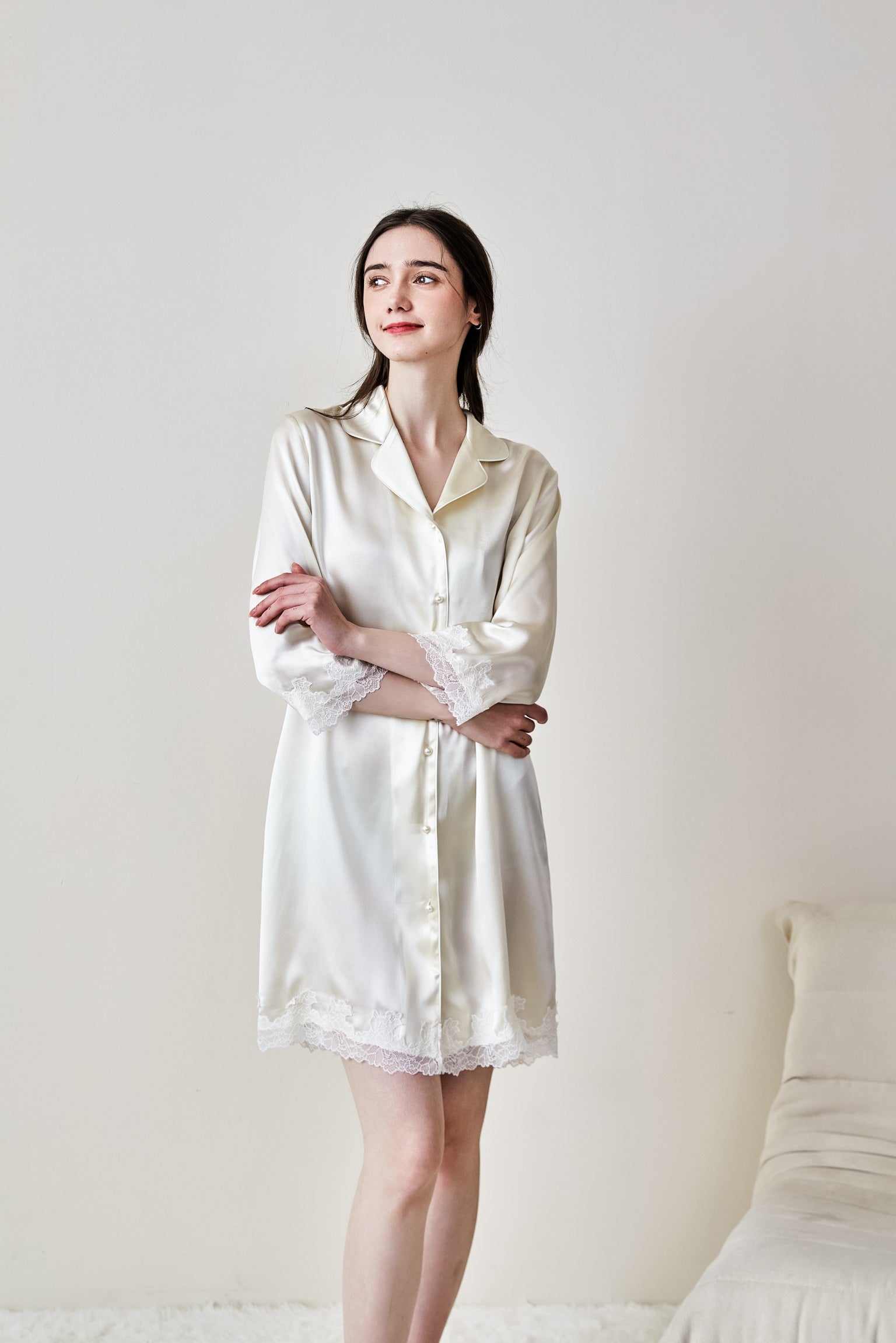 Women's silk nightdress with delicate lace trim at cuffs and hem. Featuring a classic shirt collar and button-down front, it creates a graceful silhouette. The loose fit offers effortless comfort, while the sheen of silk adds a touch of understated glamour.